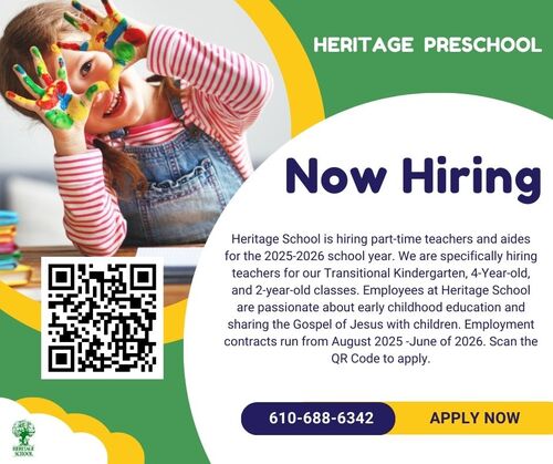 Employees at Heritage School are passionate about Early Childhood Education and sharing the Gospel of Jesus Christ with children. In this collaborative and welcoming environment, employees prayerfully work together to foster a genuine curiosity of God all day. Heritage employees have all necessary child safety clearances and sign a Biblical Lifestyle Commitment prior to beginning their employment. See below for job descriptions for various openings in Heritage School.